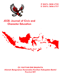 ![]() | Journal Title : Journal of Civic and Character Education Initials : JCCE Kontak : 082113120392 Frequency : 2 Issues per Year (Januari & Juli) DOI Prefix : 10.31763 by Crossref E- ISSN : 3090-6717 P-ISSN : 3090-6709 Editor-in-chief : Dr. Suriaman, S.Pd., M.Pd Publisher : CV. Rayyan Dwi Bharata Indexed : Google Scholar | Garuda | |